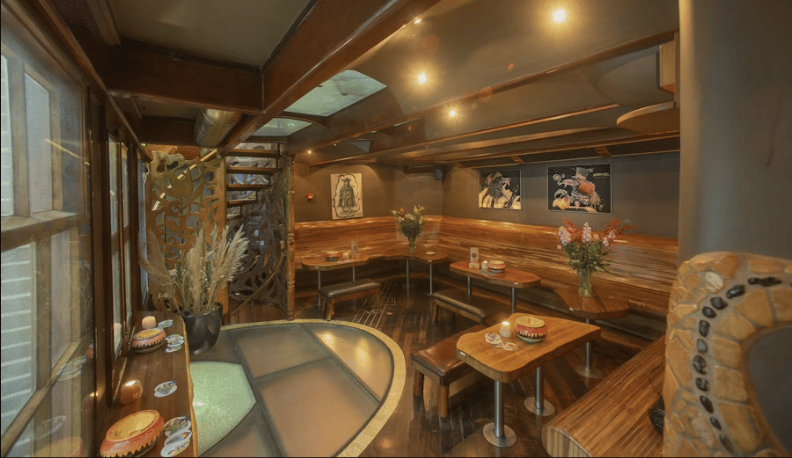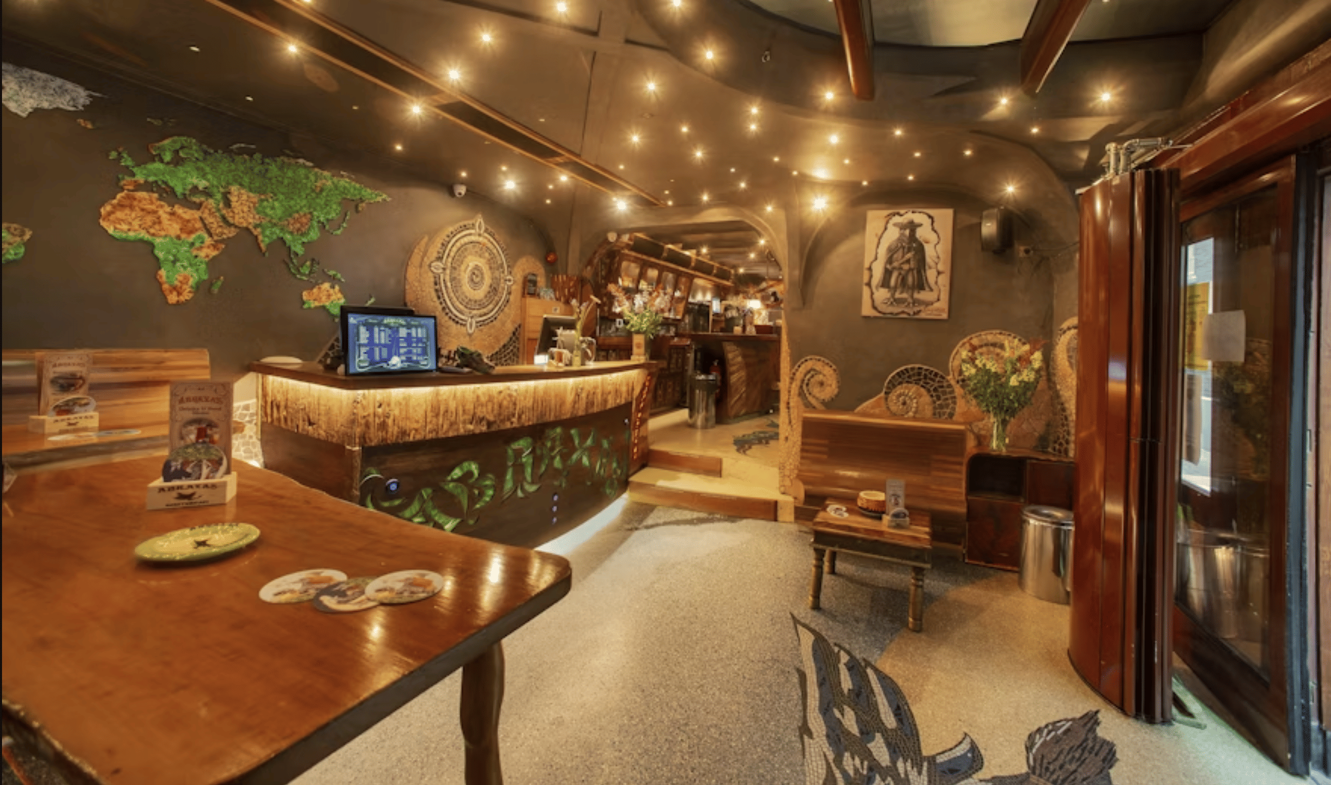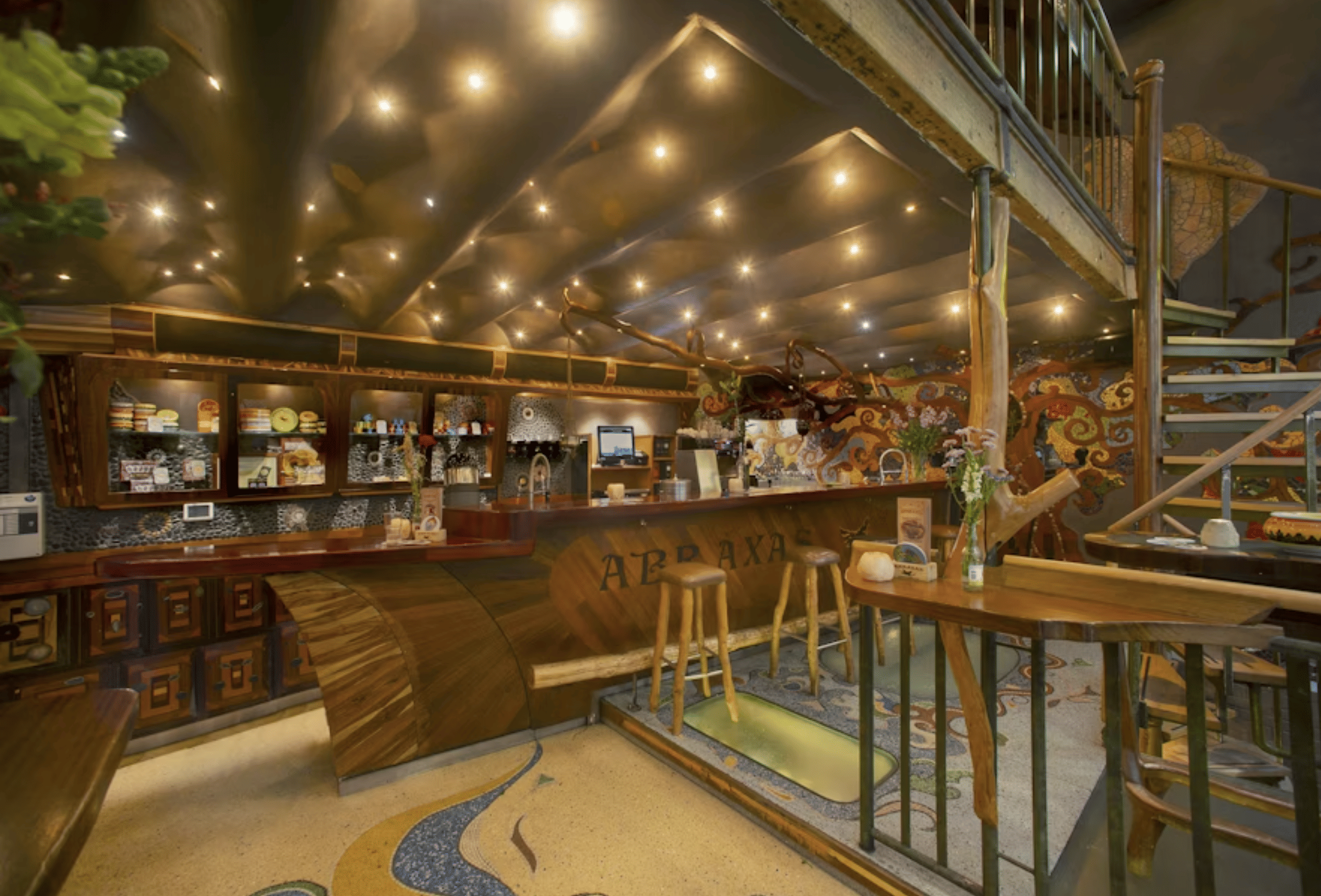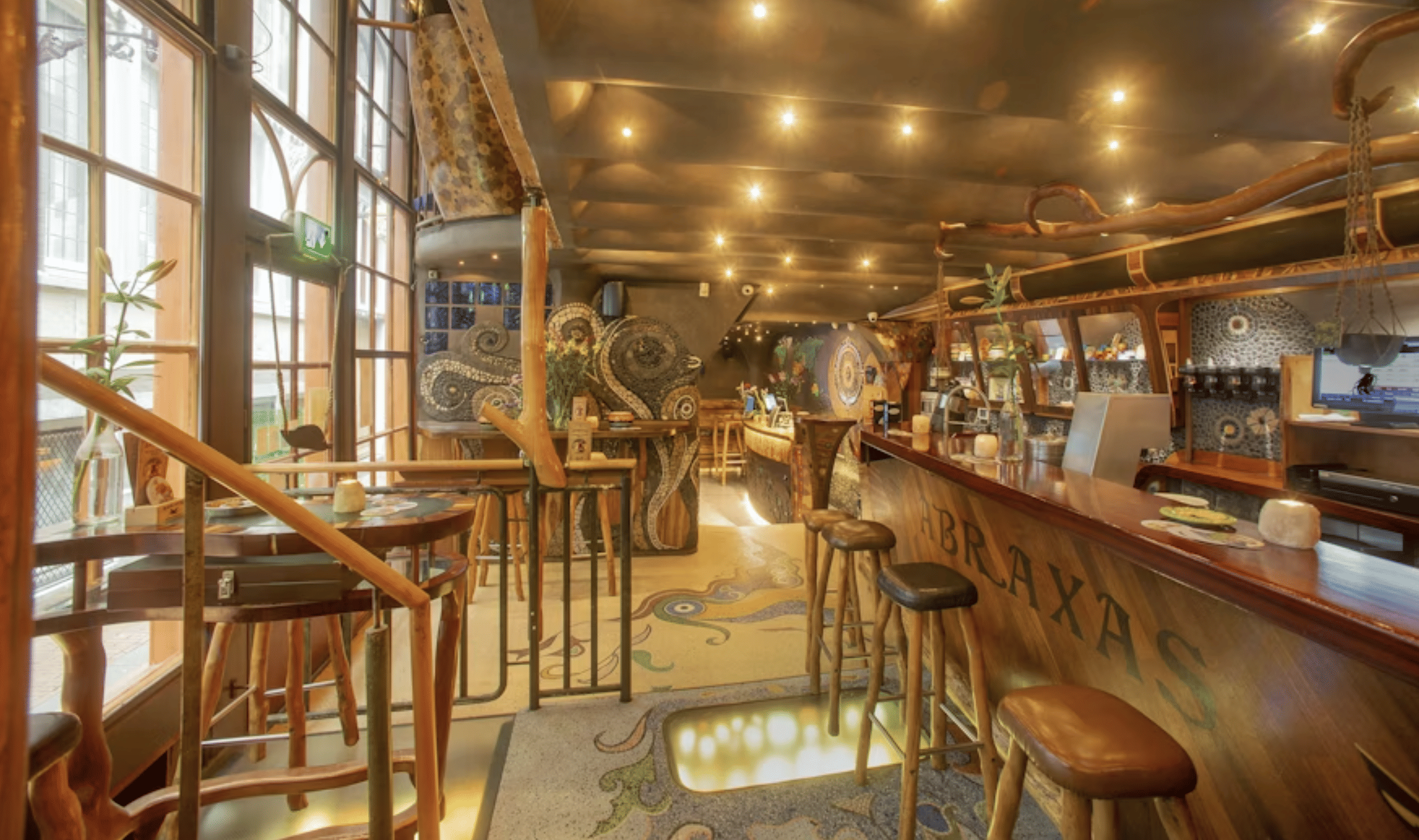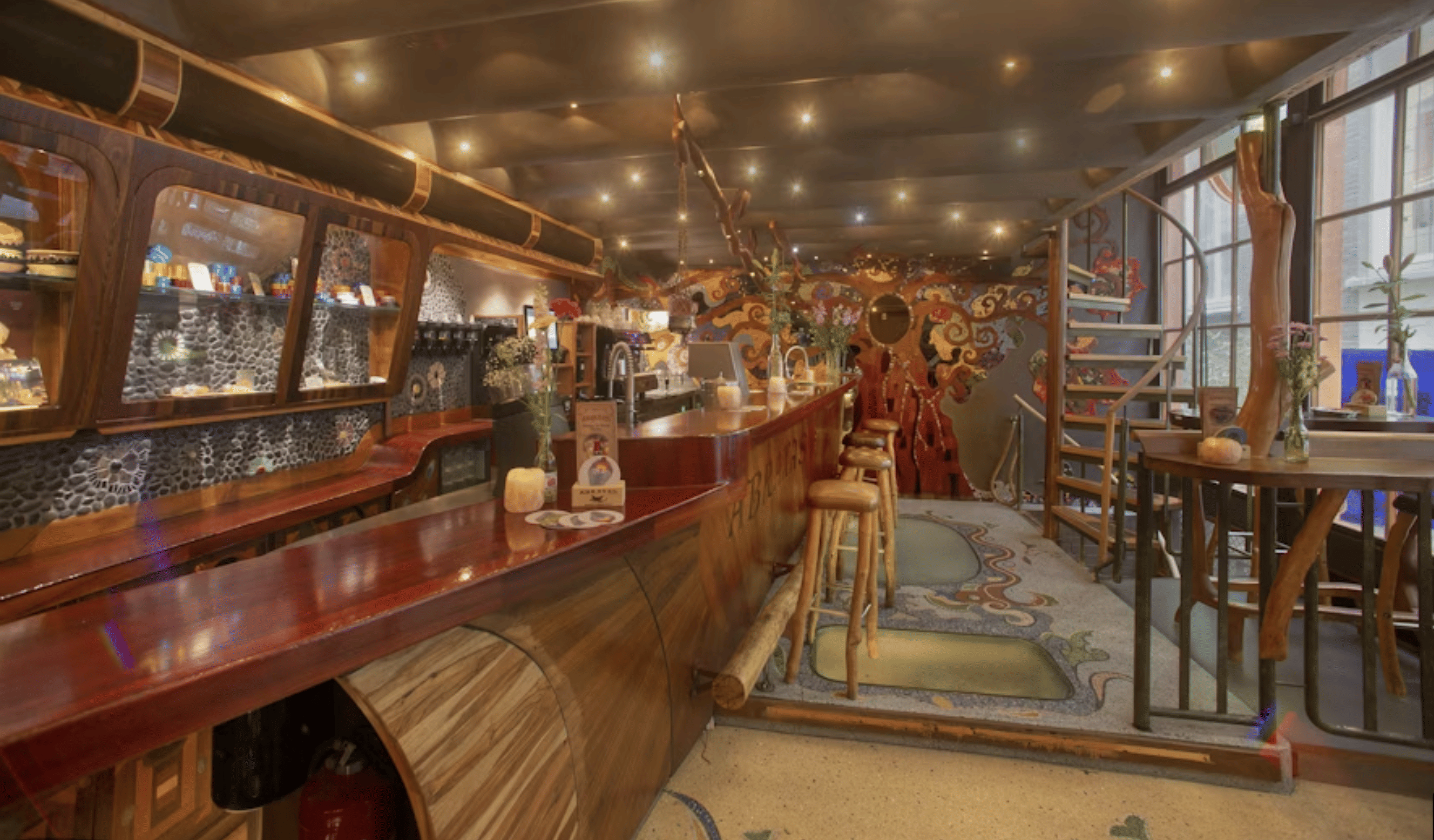 The tour's visual showstopper. Abraxas features hand-crafted shell and mosaic interiors that look more like an art installation than a café. The space spans multiple levels with intricate tile work, stained glass, and organic flowing design.