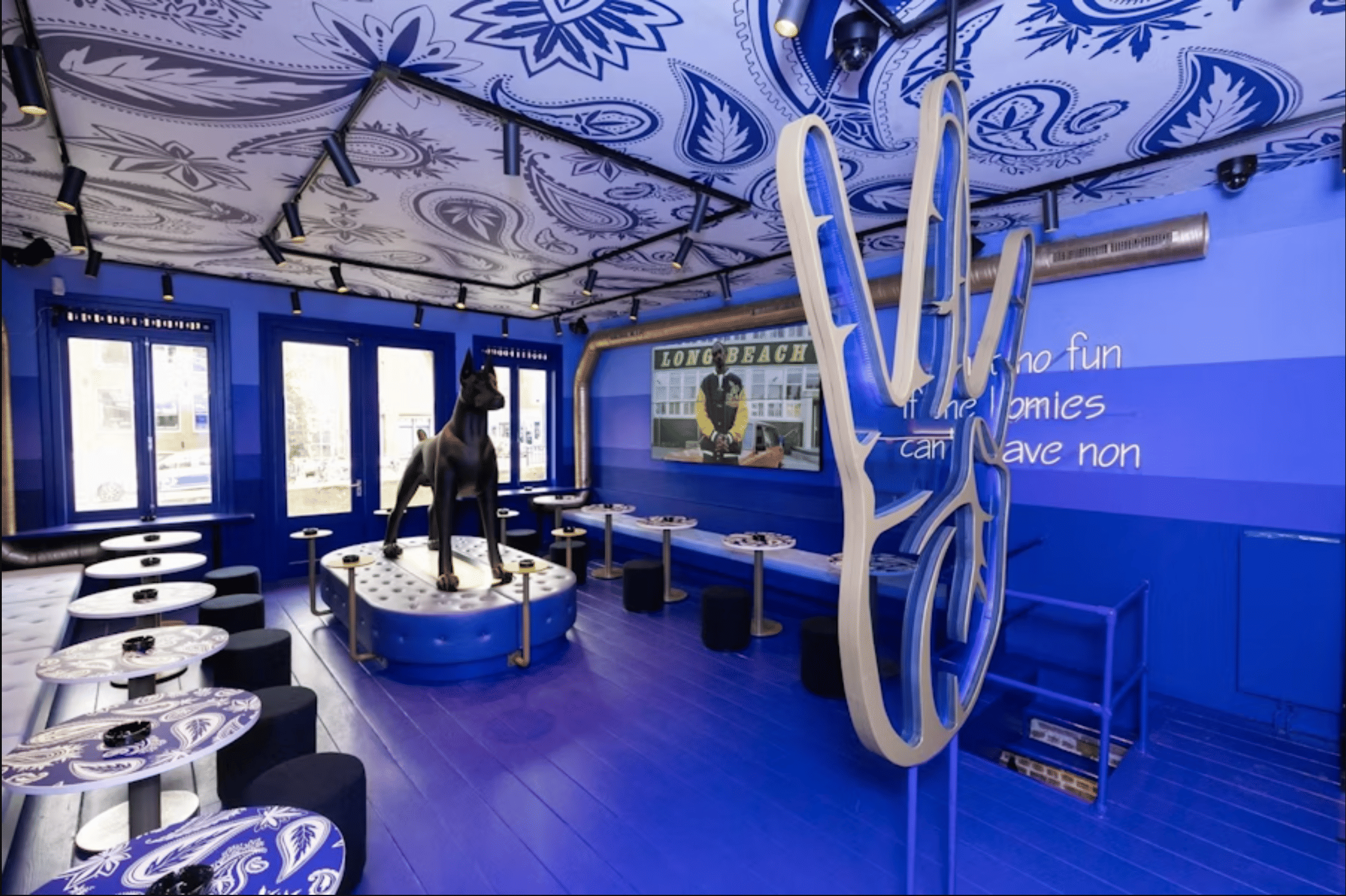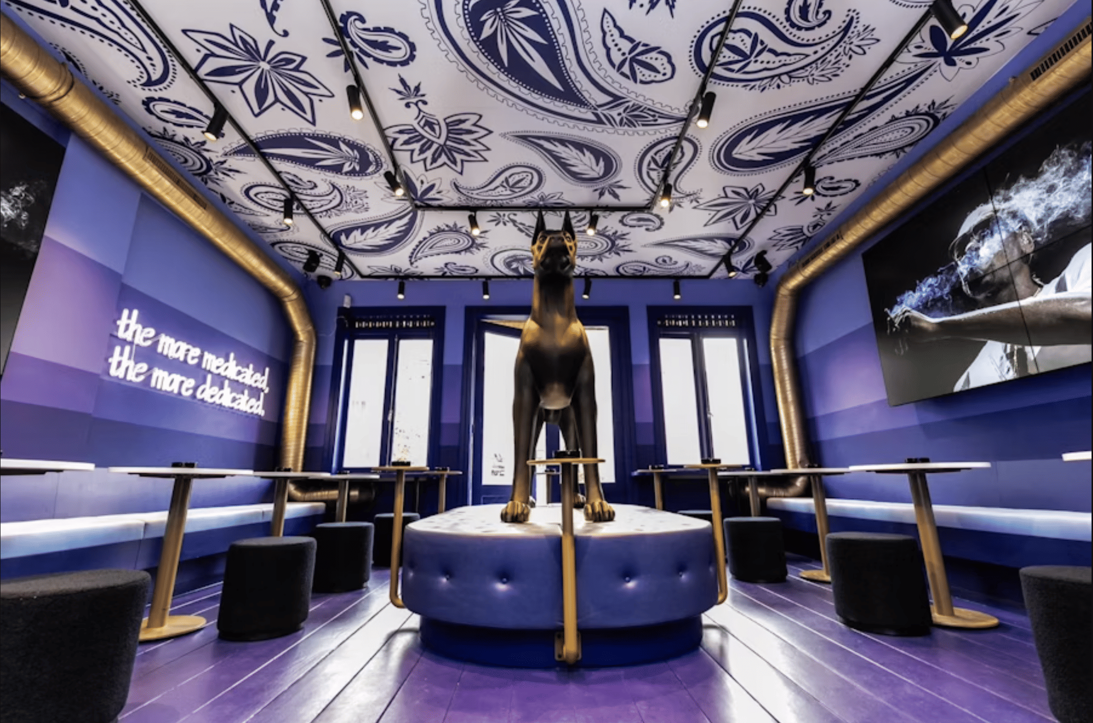 What to notice: The space-age design, the massive dog sculpture, the professional branding, the Instagram-worthy interiors. This is coffeeshop as lifestyle brand.
