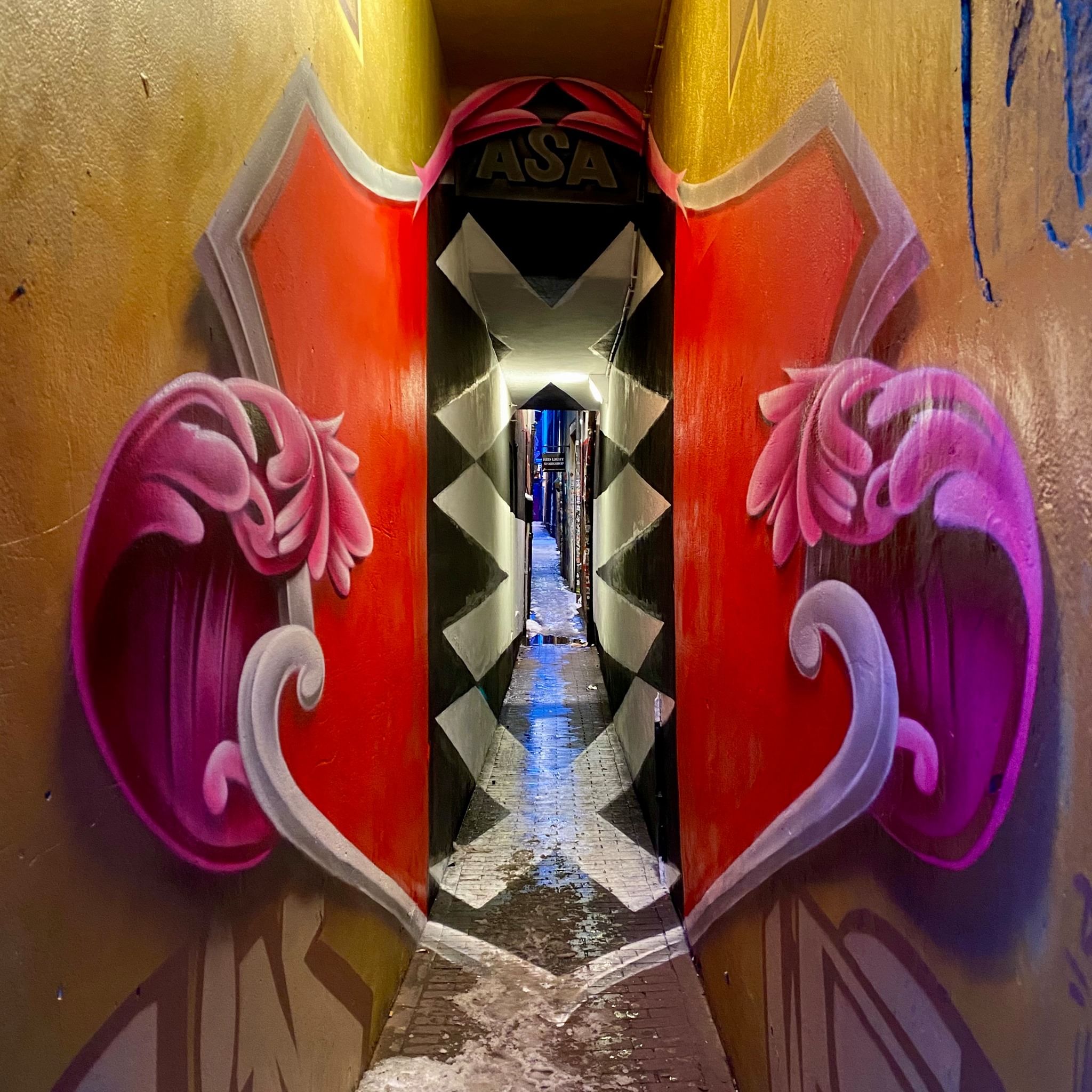 What to notice: How impossibly narrow it is, the overhead beams connecting buildings, the way medieval Amsterdam was built for walking, not vehicles.